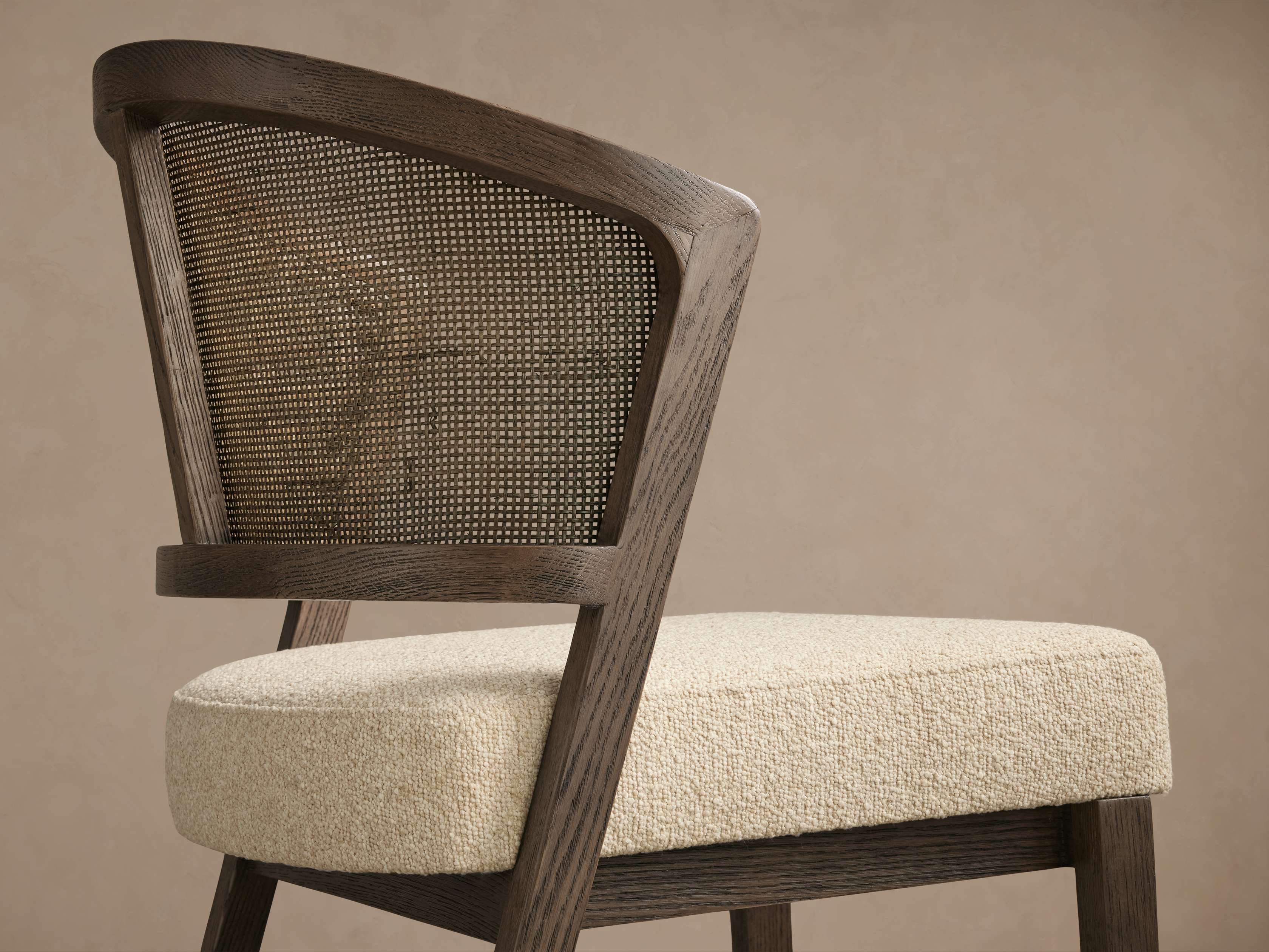 - Frames are crafted from solid oak with rattan cane backs and upholstered seats.