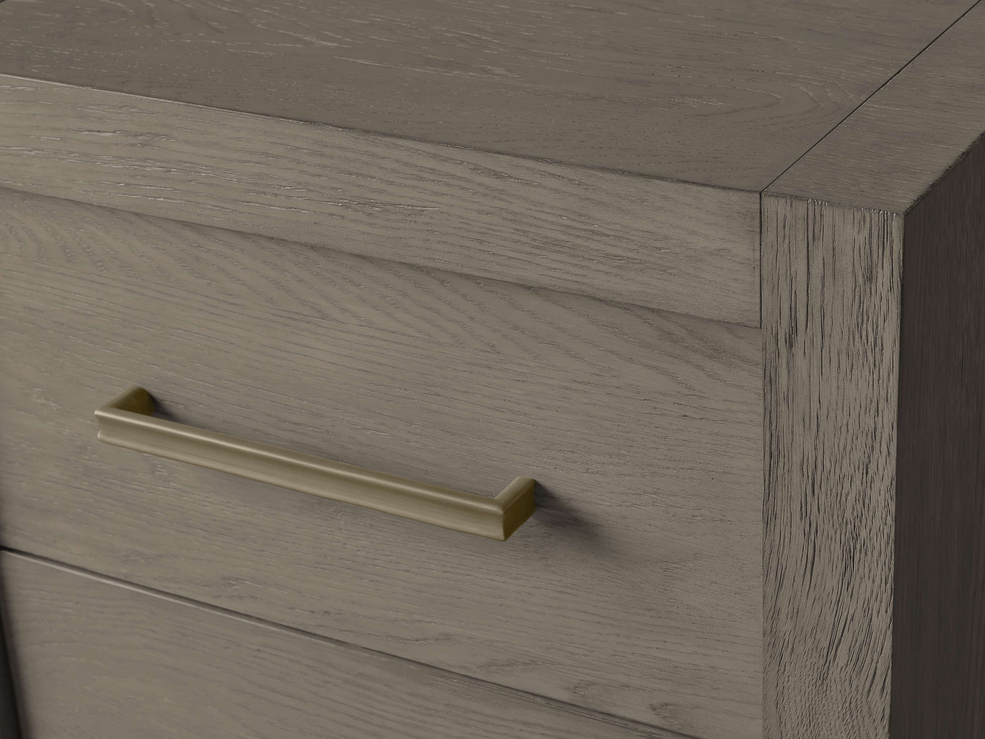 - Drawers are complemented by brass pulls.