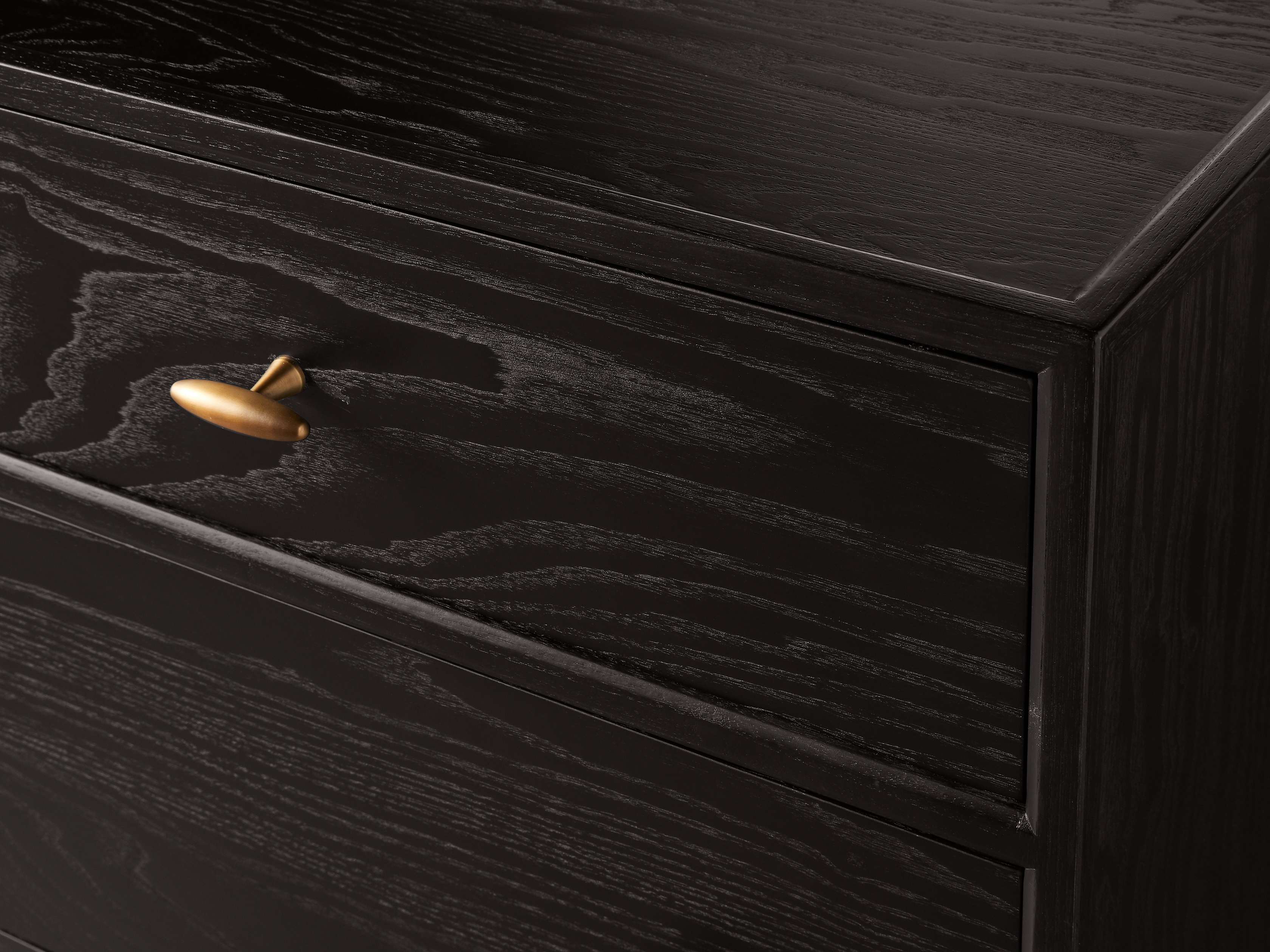 - Brass hardware features a brushed finish to complement the wood’s dark tones.