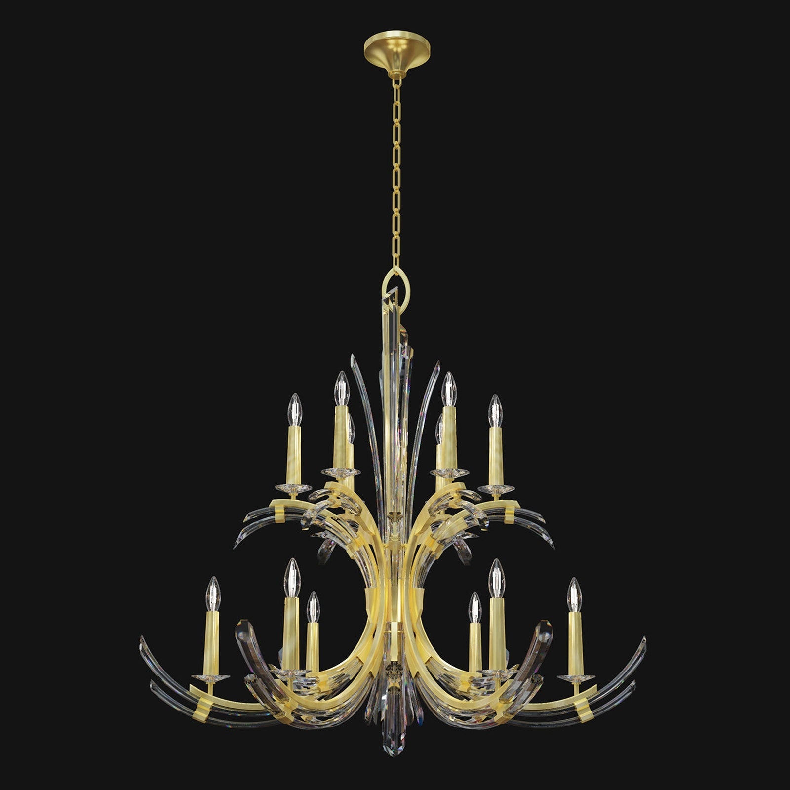 - Chandelier with gently curved hand carved crystals create fluid movement in profiles of grace and majesty.