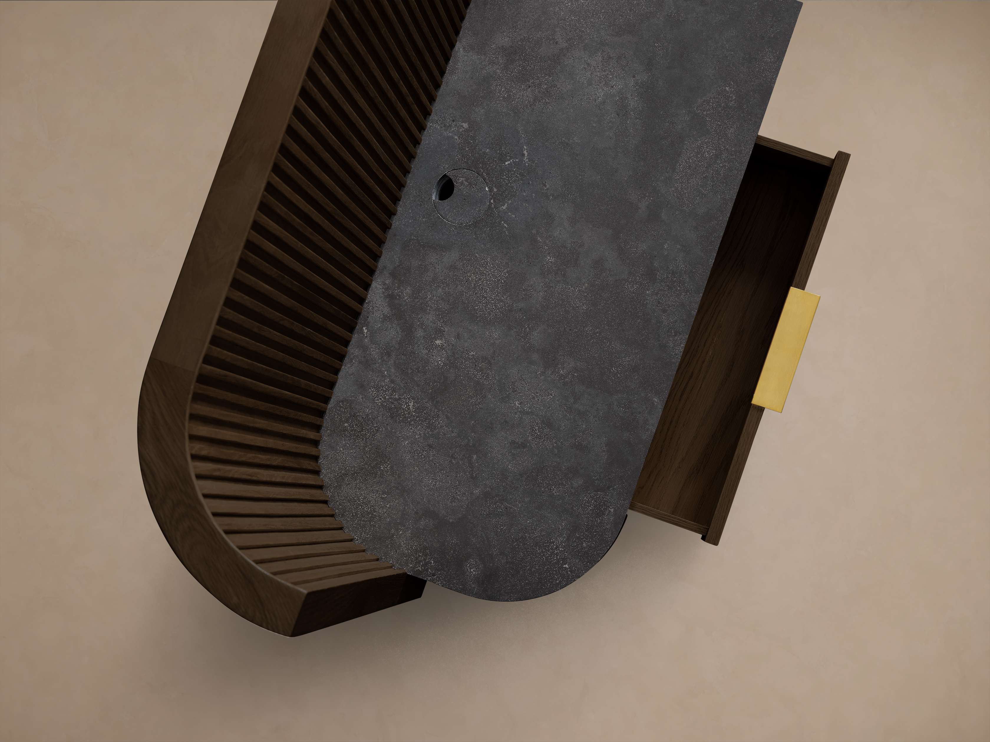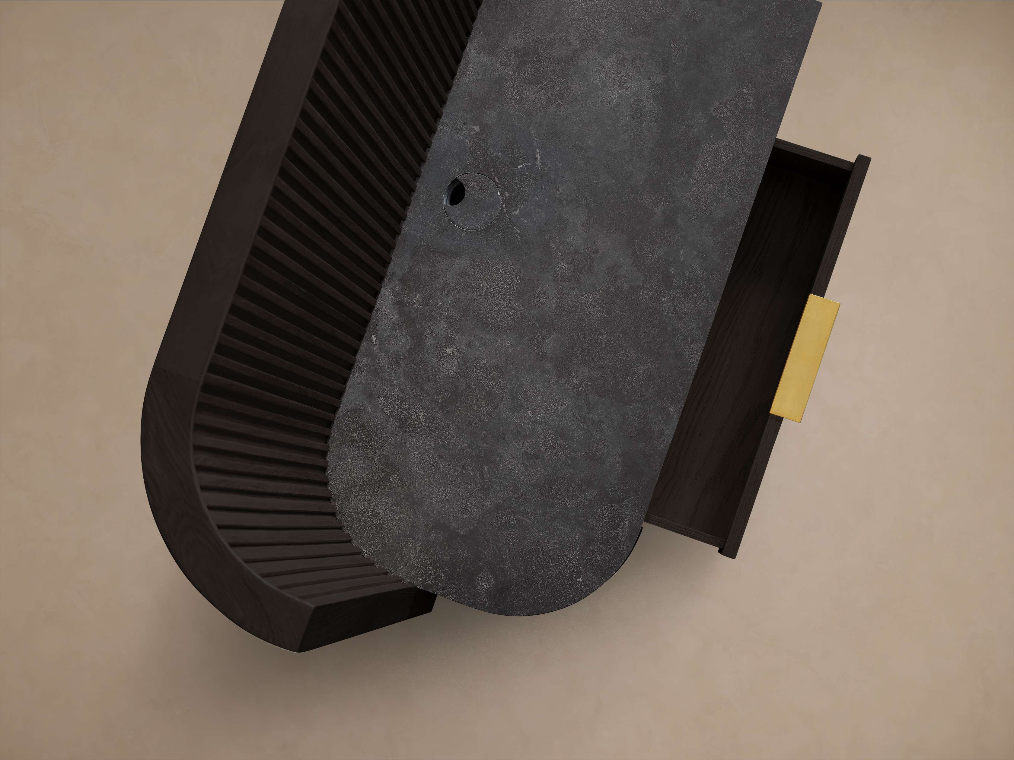 - Wood surfaces are hand-stained with a striking finish and protective lacquer for subtle sheen.