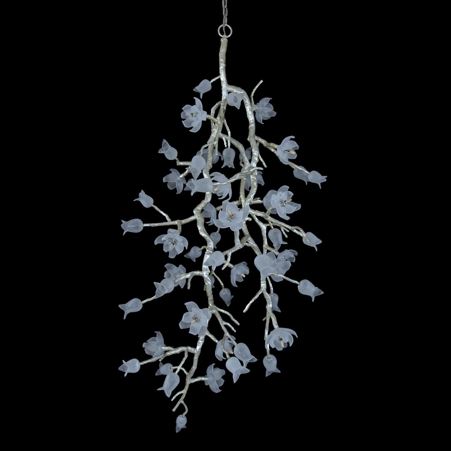 - This vertical chandelier has branches in silver leaf with twenty-one frosted mouthblown glass magnolia lights and fourteen decorative frosted mouthblown glass tulips.