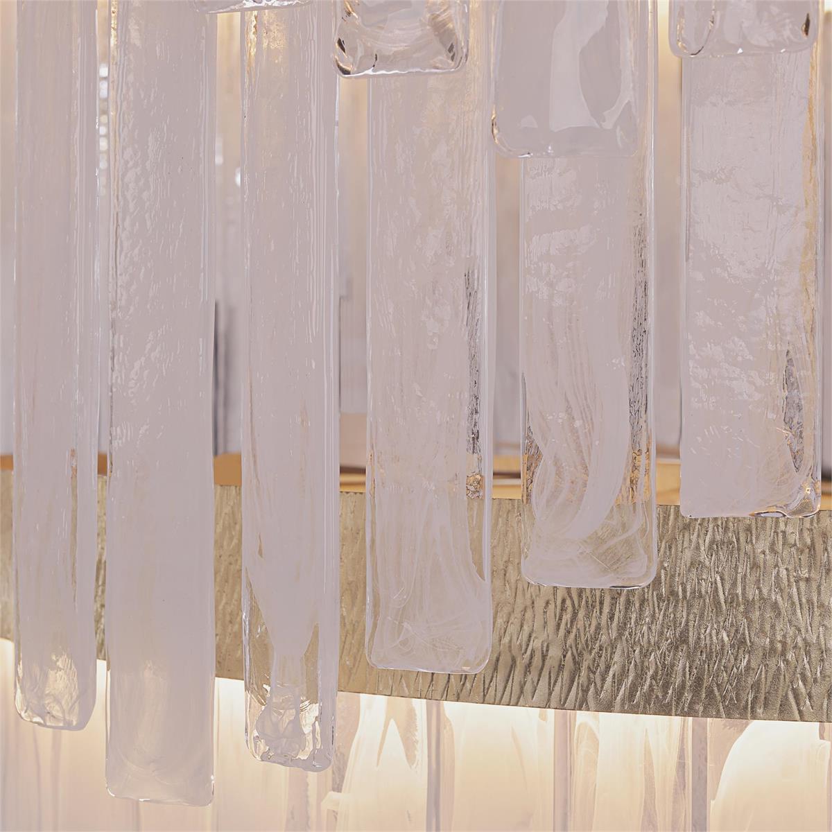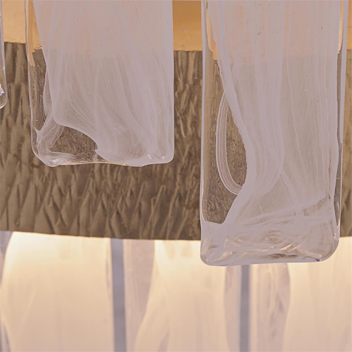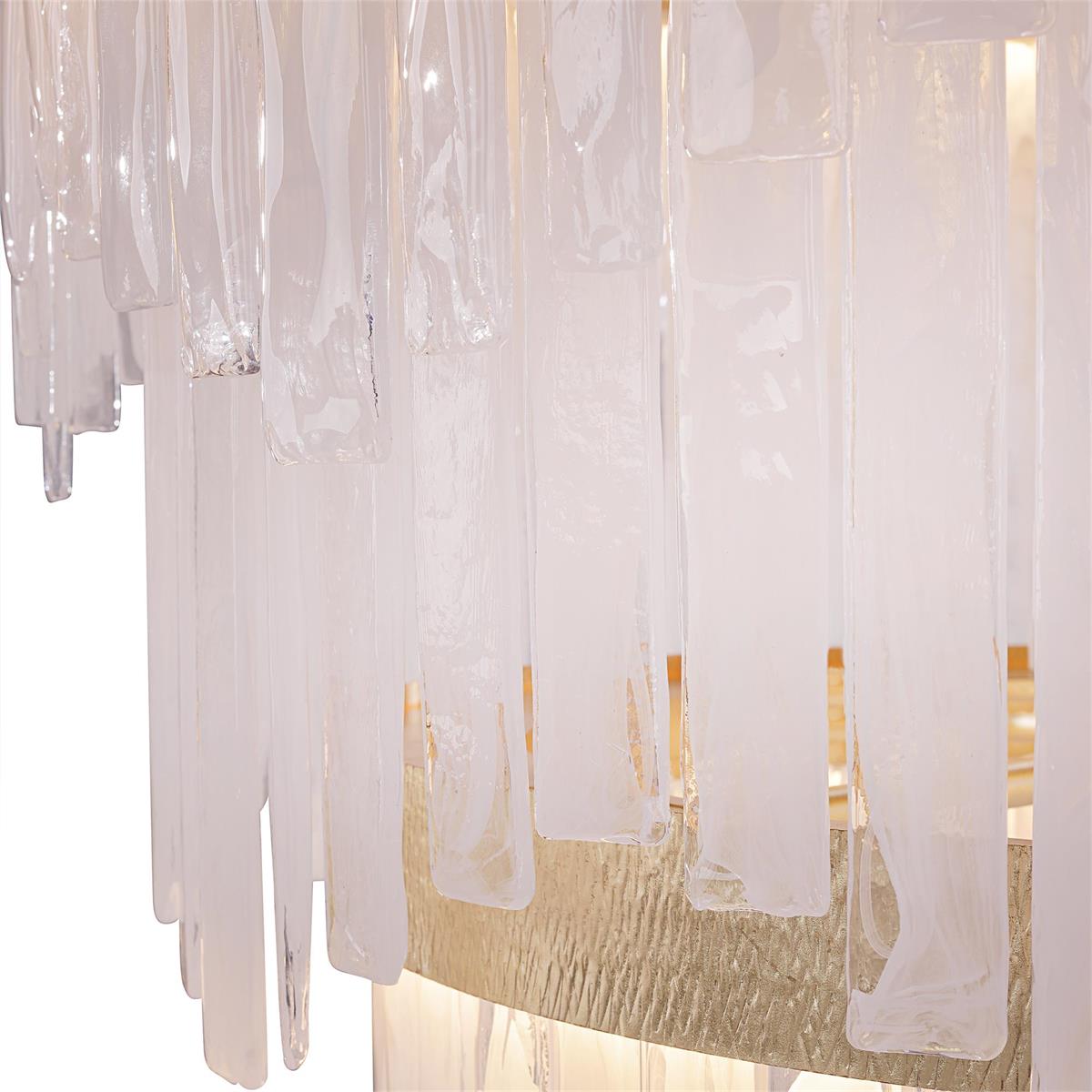 - Rectangular slabs of alabaster glass cascade from a rounded, two-tier steel frame in Light Gold Leaf, exuding sophistication and elegance.