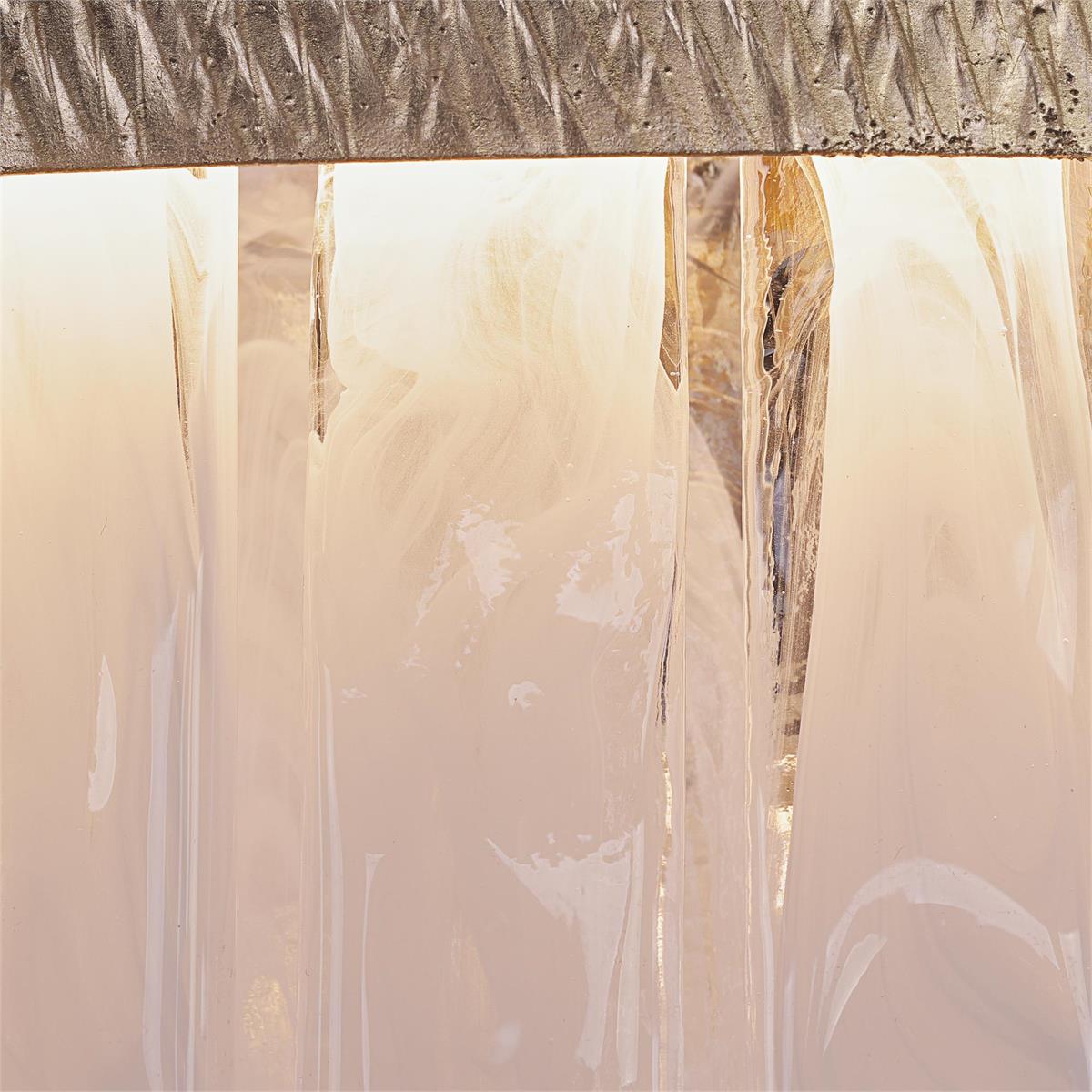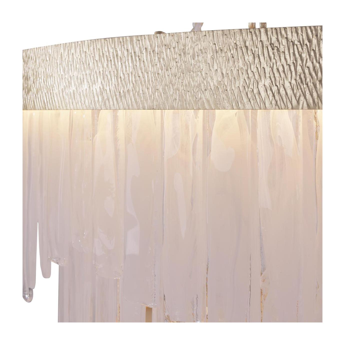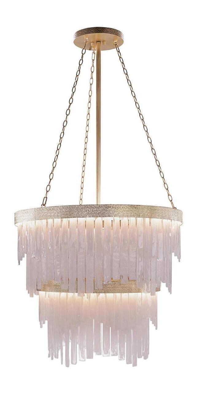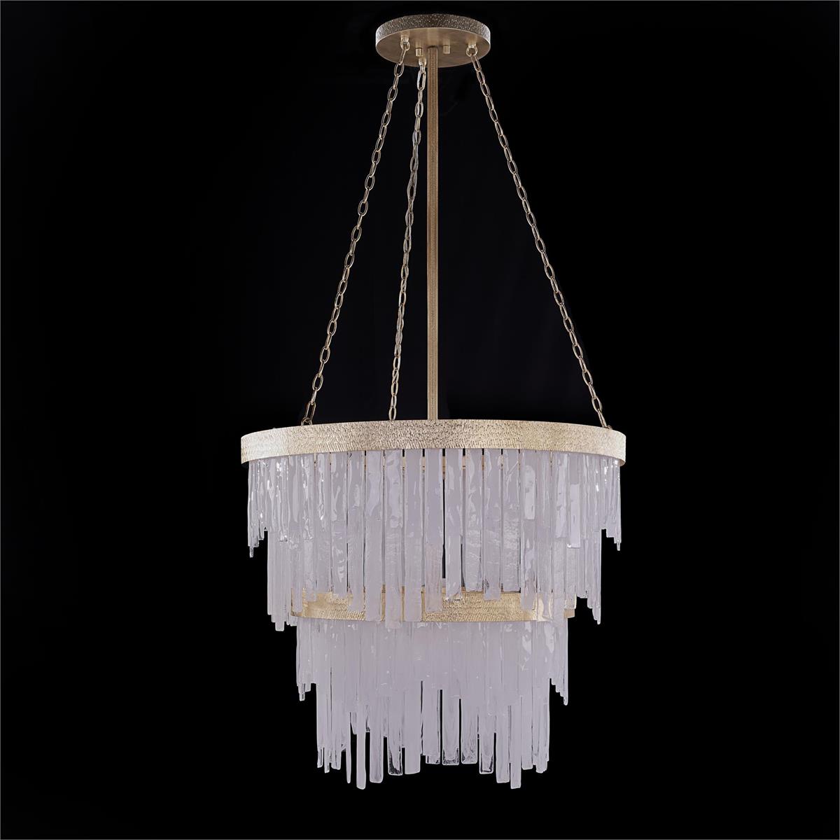 - Rectangular slabs of alabaster glass cascade from a rounded, two-tier steel frame in Light Gold Leaf, exuding sophistication and elegance.