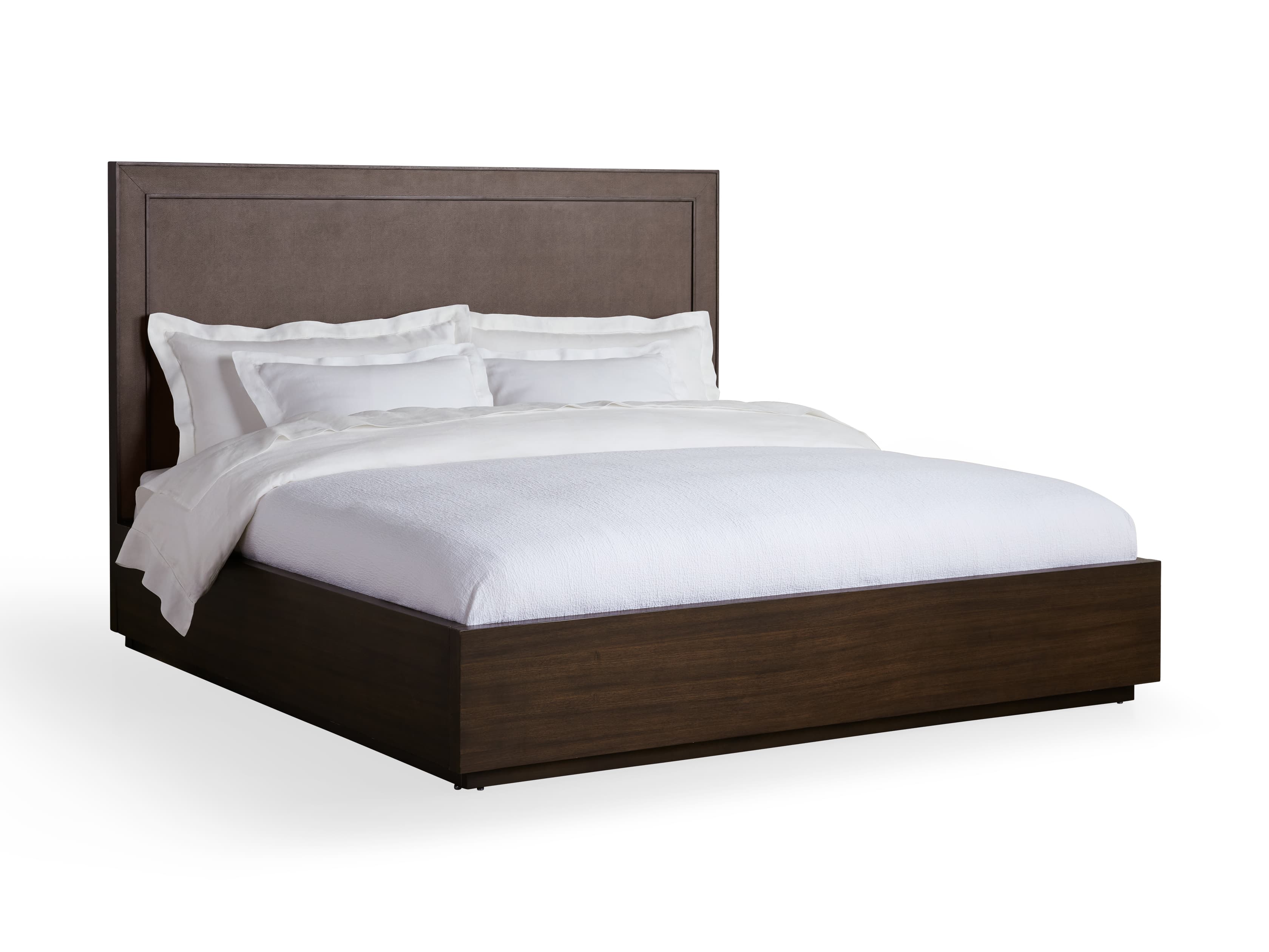 - Upholstered headboard and footboard are encased in wood frames featuring complementary neutral color tones.