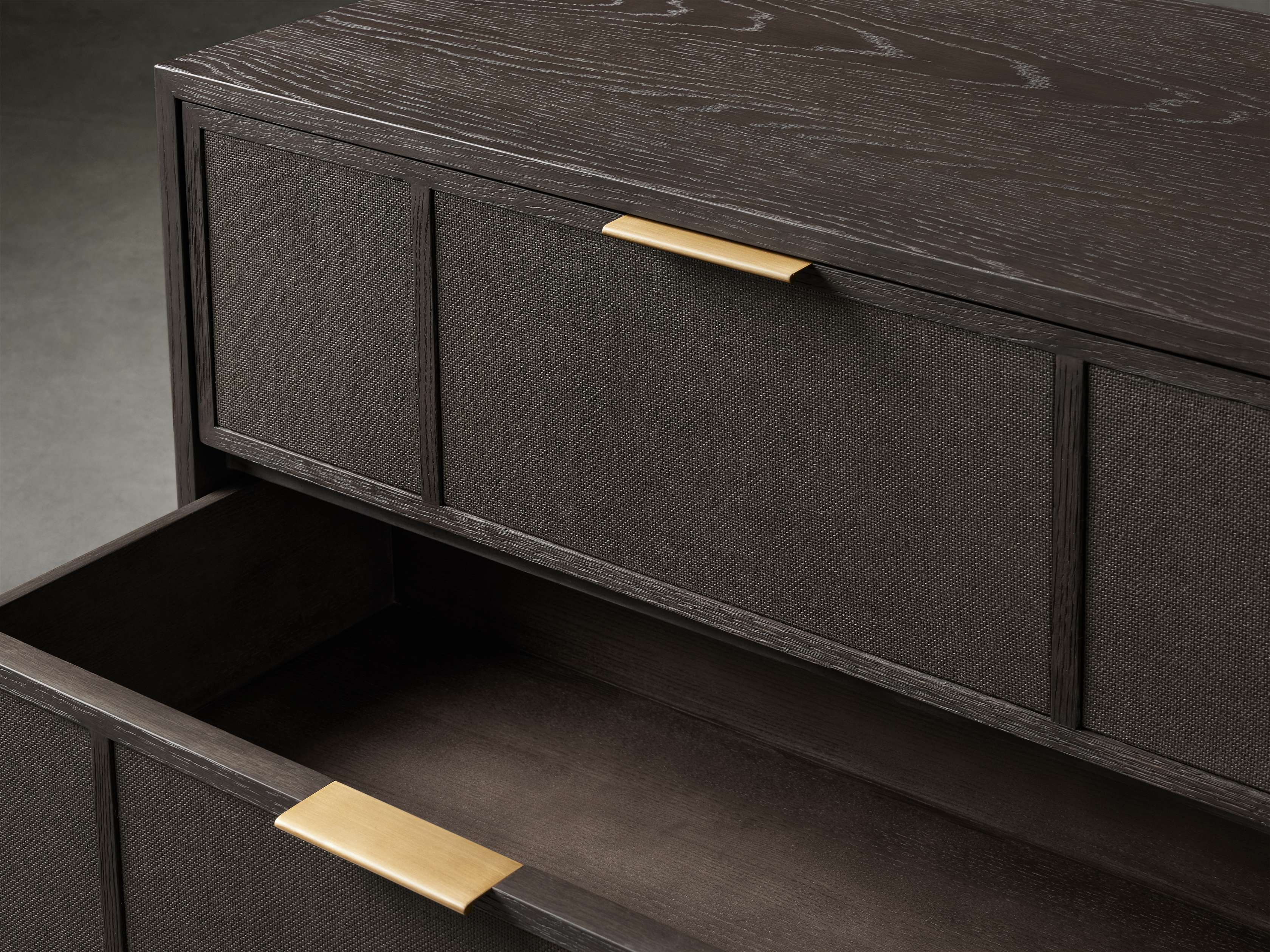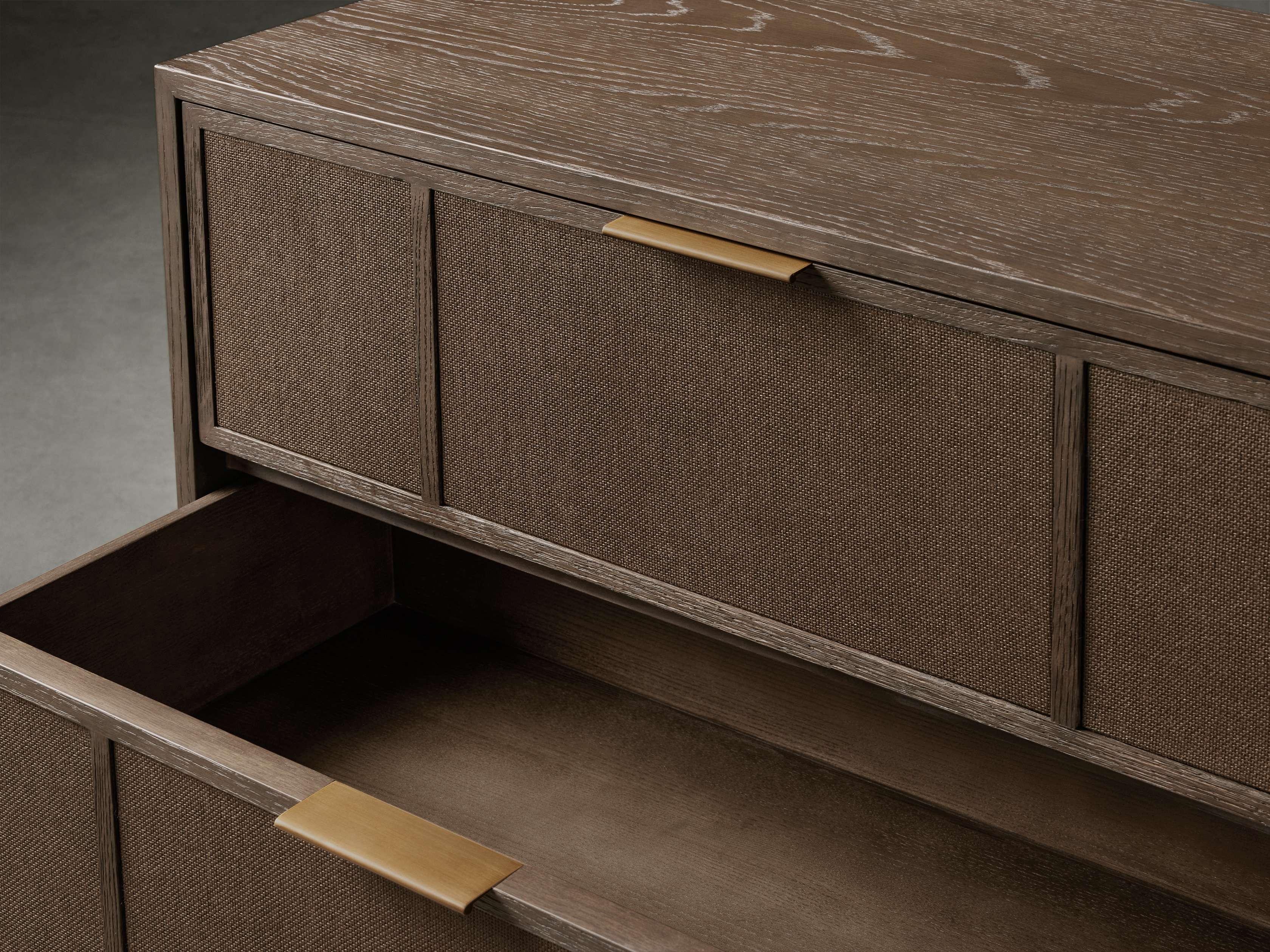 - Crafted from a blend of solid oak wood and oak veneers with textured raffia drawer fronts.