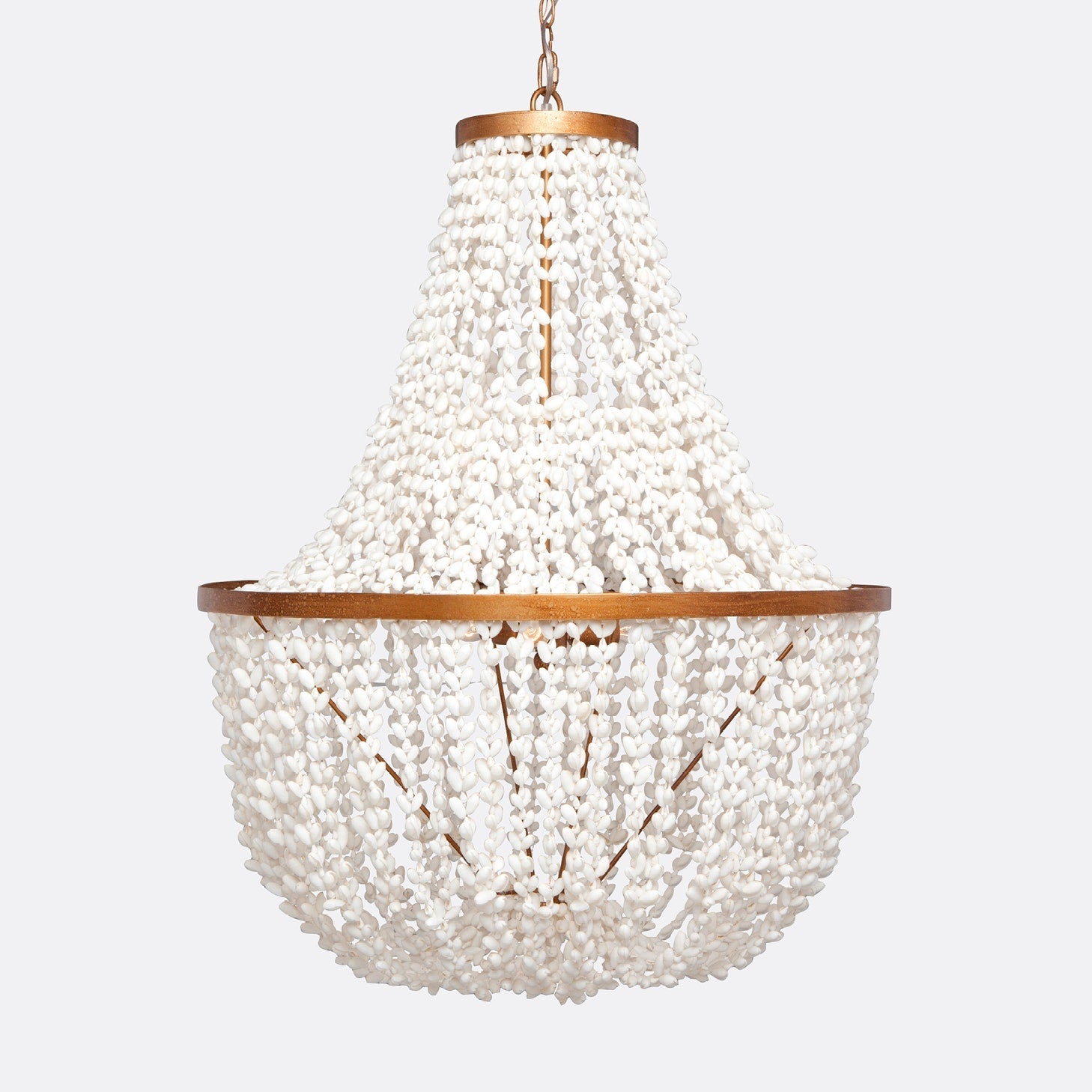 - A classic empire chandelier is made fresh and airy through the use of pure white shells.